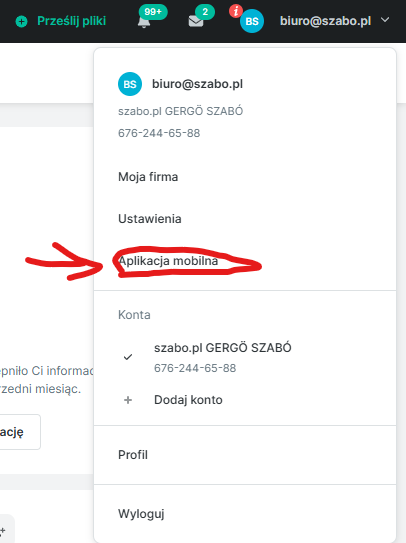 Click on your email address and choose "Aplikacja mobilna" from the menu