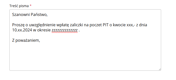 If you do not have a case ID or a case at all, make sure the recipient knows what you wish share with them. Add identification data (NIP, PESEL), name a related document (like "PIT-36 za 2023") and a short description.